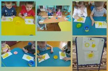 Цель: научить детей изображать на рисунке солнце, рисовать прямыми линиями круглую форму. Продолжать учить получать краску только должным образом. Развивать самостоятельность.