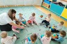 Нәниләр физик тәрбия бирү шогылендә туп белән уйныйлар./ Самые маленькие на занятиях по физкультуре играют с мячиками. 07.09.2023