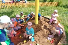Җәй көне мәйданчыкка чыккач, уртанчылар төркеме балаларының иң яраткан шөгыльләренең берсе - ком белән төрле уеннар уйнау. Комнан ясаган корылмалар, "пироглар", "тортлар" бик матур килеп чыга.