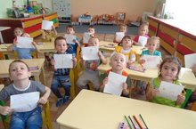 Һәммәбез сагынып көттек май килүне - китерә ул безгә иң Бөек Җиңүне!.. Кечкенәләр төркеме балалары бәйрәмне үзләренең рәсемнәрендә чагылдырдылар.