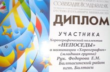 Хореографический коллектив "Непоседы" под руководством музыкального руководителя Федоровой Е.М. за участие в откратом республиканском телевизионном молодежном фестивале эстрадного искусства "Созвездие - Йолдызлык" был награжден дипломом. Поздравляем!