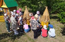 Хоровод балаларга аларның һәрберсе коллективның мөһим өлеше дип хис итәргә мөмкинлек бирә. Бүген уртанчылар төркеме балалары белән «Ак калач»уенын уйнадык. Хәтта иң шук һәм гиперактив балалар үзләре дә сизмәстән күңелле уенга кушылдылар. Ә прогулка вакытында тәрбияче ярдәменнән башка да күмәк уен оештырдылар. /Хоровод дает почувствовать детям, что каждый из них- важная часть коллектива. Сегодня с детьми средней группы поиграли в игру «Каравай». Даже самые шустрые и гиперактивные дети включались в игру. А на прогулке дети сами водили хороводы.