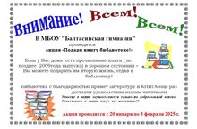 20нче гыйнвардан 3нче февральгә кадәр Балтач гимназиясе китапханәсендә «Китапка икенче тормыш» акциясе үткәрелә. Һәркем китапханә фондын баетуга үзеннән өлеш кертә ала. Акциядә читтә калмаучы hәркемгә рәхмәтебезне белдерәбез.