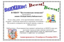 В МБОУ «Балтасинская гимназия» проводится акция «Подари книгу библиотеке!». Если у Вас дома есть прочитанные книги (не позднее 2009 года выпуска) в хорошем состоянии - Вы можете подарить им вторую жизнь, отдав в библиотеку! Библиотека с благодарностью примет литературу и книга ещё раз доставит удовольствие нашим читателям. Участие в акции осуществляется только на добровольной основе! Акция проводится с 15 ноября по 25 ноября 2025 г. Участвовать в акции могут все желающие!