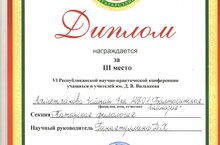 Ахметханова Зайнап, ученица 7 Б класса, заняла 3 место в VI Республиканской научно-практической конференции учащихся и учителей им.Д.В. Вилькеева. Поздравляем Зайнап и её руководителя Гиниятуллину Д.Х. с большой победой.
