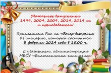 Уважаемые выпускники 1999, 2004, 2009, 2014, 2019 годов и преподаватели! Приглашаем Вас на «Вечер встречи» в гимназию, который состоится 3 февраля 2024 года в 15.00 ч.