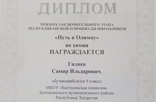 Поздравляем Самира и его руководителя Хафизову Э.М. Молодцы!9нчы И сыйныфы укучысы Галиев Самир химия фәне буенча «Олимпка юл» республика олимпиадасында призер булды.