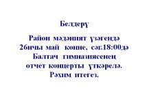 Район мәдәният үзәгендә 26нчы май көнне, сәг.18:00дә Балтач гимназиясенең отчет концерты үткәрелә. Рәхим итегез.