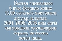 Балтач гимназиясе 6 нчы февраль көнне 15:00 сәгатътә мәктәпнең актлар залында 2001, 2006, 2016 нчы елгы чыгарылыш укучыларын очрашу кичәсенә көтеп кала. Рәхим итегез!