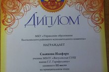 4 сыйныф укучысы Салихов Илфар "Новогодняя сказка" дип исемләнгән республика күләмендә узучы конкурсның район турында катнашты һәм "Зимушка зима" исемле шигырь сөйләүчеләр номинациясендә 3 урынны яулады.