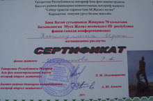 11 сыйныф укучысы Хәкимуллина Иркә Бөек Ватан сугышында Җиңүнең 70 еллыгына багышланган Муса Җәлил исемендәге 3 республика фәнни-гамәли конференциядә катнашып сертификатка ия булды.