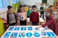 Дети подготовительной группы играют в игру: "Назови правильно дорожный знак".