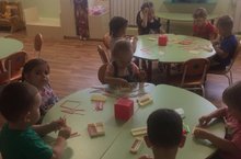 Дети подготовительной группы занимаются по теме: "Детский сад". Они рассказывают о садике, о профессиях сотрудников, про любимые игрушки и игры.