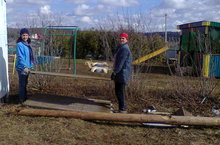Коллектив Карадуванского детского сада вышел на Всеросийский субботник. Наша заведующая и завхоз дружно переносят доски.