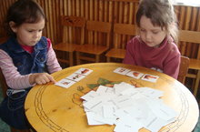 Дети старшей группы играют в игру "Логические пары". Они подбирают пары карточек, логически связанных между собой, например, карточки с изображением неба и летящего самолета или пирожков Красной Шапочки. Также по карточкам придумывают предложения на русском языке.