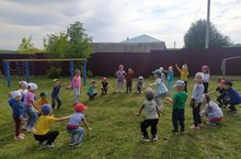 Сәламәтлек атналыгында кечкенәләр төркеме балалары белән төрле хәрәкәтле куңелле уеннар оештырабыз."Сукмак буйлап","Матур тубым","Флаг янына йөгерегез".