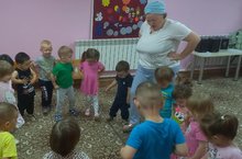 Вместе с детьми второй группы раннего возраста провели музыкальное развлечение. Здесь у детей развивать способность воспринимать и воспроизводить движения, показываемые воспитателем (хлопать, топать) также умение заканчивать движения с окончанием музыки.