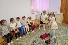 Фазылзянова Зарина проводит игру " Это чей?, Это чья? " в старшей группе с игрушечной мебелью.