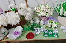 Рәсем эшчәлегендә традицион булмаган рәсем ясау ысулын кулланып (кабартылган поилэтилен пакет һәм кәгазь салфеткадан бушаган картон цилиндрдан кисеп алынган бер өлеш) чәчәк бәйләмнәре ясадык.