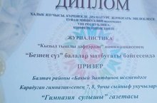 Карадуган гимназиясенең 7,8,9нчы сыйныф укучыларының "Гимназия сулышы" газетасы Туфан Миңнуллин исемендәге VIII республика конференциясенең "Безнең сүз" балалар матбугаты бәйгесендә призер. Җитәкчеләре - Гарифуллина Эльмира Мәсхүт кызы. Котлыйбыз!