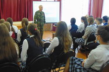 В гимназии была проведена беседа по военно-профессиональной ориентации должностными лицами военного комиссариата.Гимназиядә хәрби-профессиональ ориентация юнәлеше буенча хәрби комиссариат хезмәткәрләре тарафыннан әңгәмә оештырылды. -
