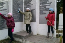Һәйкәлләрне хөрмәтлибез. 6 нчы сыйныф укучылары һәйкәл яннарын җыештыралар.