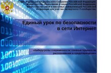 Урок «Безопасность в сети Интернет» (в рамках проведения Единого урока безопасного Интернета) проводится с целью обучить детей личной и информационной безопасности в Интернете, сформировать навыки поведения в информационном обществе с целью обеспечения информационной безопасности, а также разработать нормы и правила безопасного поведения в сети Интернет. ... Разработка урока. «Безопасность в сети Интернет». (в рамках проведения Единого урока безопасного Интернета). Цель: изучить опасные угрозы сети Интернет и методы борьбы с ними