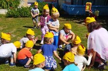 Сегодня с детьми рисовали на асфальте солнышко, а с помощью трафаретов овощи./ Бүген балалар белән асфальтта кояш ясадык, трафаретлар ядәмендә яшелчәләр./ Творчестволы сизем арняе покчи группаысь пиналъëс асфальт вылын шунды суредазы, нош группаын трафаретэн суредаса бакча емышъëсты буязы.