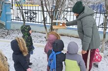 Наблюдение за птицами с детьми ясельной группы. Положили в кормушку хлебные крошки,чтобы понаблюдать, как птицы клюют корм.