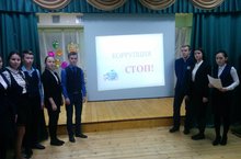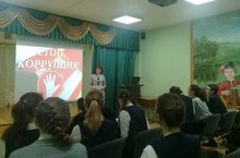 В 11 классе учитель обществознания Медведева Н.Н. провела занятие на тему «Коррупция – СТОП!». С учащимися был обсужден вопрос коррупции в разные времена, рассмотрены способы борьбы с данной проблемой. Ученики решали ситуации по определению форм коррупции.Занятие способствовало формированию антикоррупционного мировоззрения.