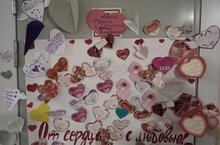 Учащиеся школы поздравили учителей с Днём Святого Валентина. Разместили на плакате сердечки с добрыми пожеланиями.