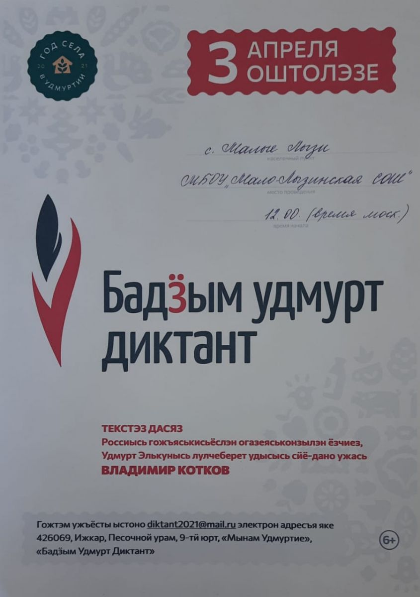 Опубликовано: 03.04.2021Сегодня,3.04.2021 года ,в 12.00 часов по московскому времени на базе нашей школы прошёл БУД(Большой удмуртский диктант).Участвовало 25 человек.Среди участников был заместитель главного редактора районной газеты "Азьлане" ("Вперёд".Хезмэт") Плотникова Ольга Юрьевна.