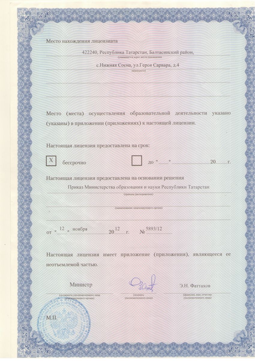 | Адрес: | 422240, Республика Татарстан, Балтасинский район, с. Нижняя Сосна, ул. Героя Сарвара, д. 4 |