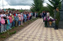 “Ромашка” мәктәп яны лагерындагы балалар шушы олуг көнгә багышланган митингта катнаштылар. Бер минут тынлык белән һәлак булган авылдашларыбызны искә алдылар.