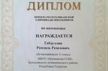 Мәктәбебезнең 11 класс укучысы Габдуллин Рәмзил Разилович "Путь к Олимпу" республика олимпиадасында математика буенча призер булды. Рәмзилне бу җиңүе белән чын күңелдән котлыйбыз, уңышлар телибез! Рәмзилне әзерләгән математика укытучысы Хабибрахманов Айрат Зиннатулловичка рәхмәтебезне белдерәбез.