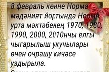 8 февральдә Норма мәдәният йортында Норма урта мәктәбен 1970, 1980,1990, 2000, 2010 нчы елларда мәктәпне тәмамлап чыгучылар очрашуы. Башлана 13.00 сәгатьтә. Рәхим итегез!