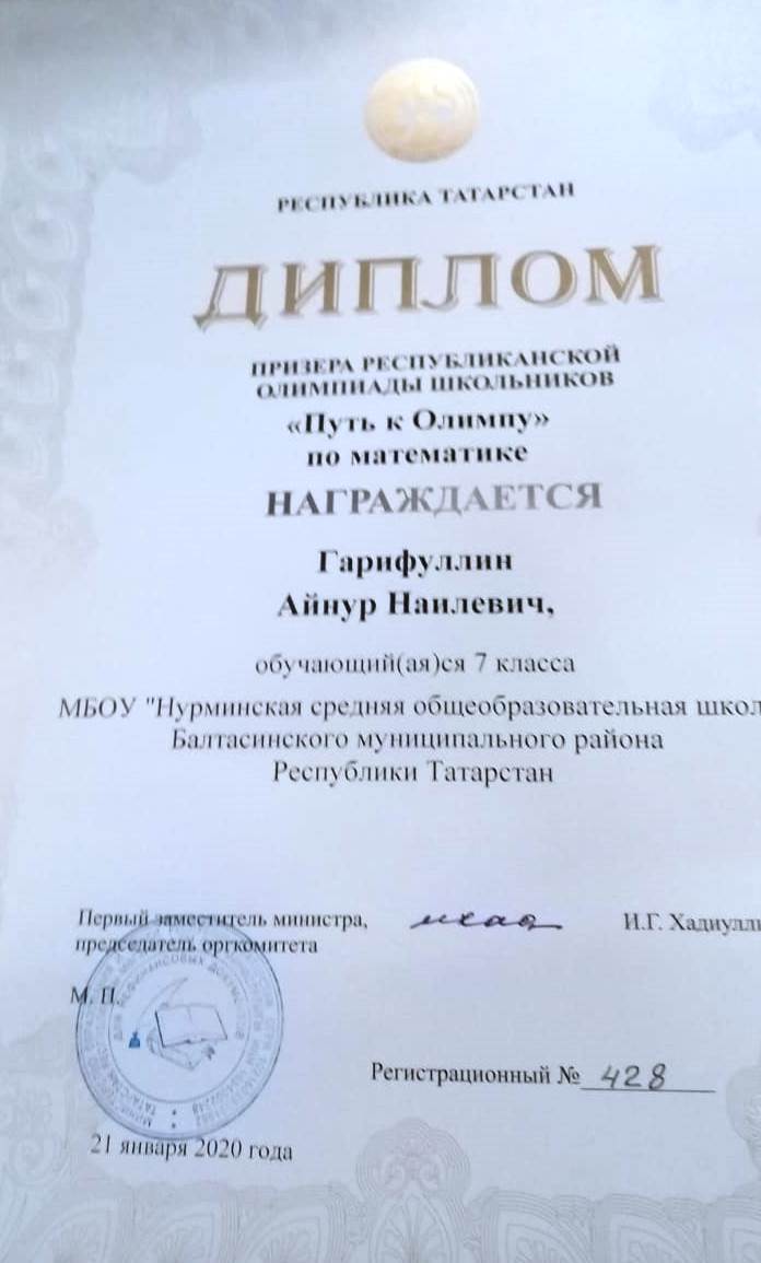 Опубликовано: 03.02.2020Мәктәбебезнең 7 Б классы укучысы Гарифуллин Айнур Наилевич "Олимпка юл"математика буенча республика олимпиадасында призер булды. Котлыйбыз!