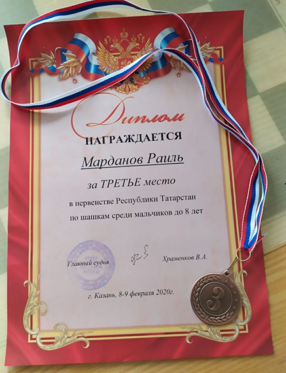 Опубликовано: 10.02.2020Марданов Раиль 8 яшькә кадәр булган балалар арасында шашка буенча Татарстан Республикасы беренчелегендә 3нче урын алды.