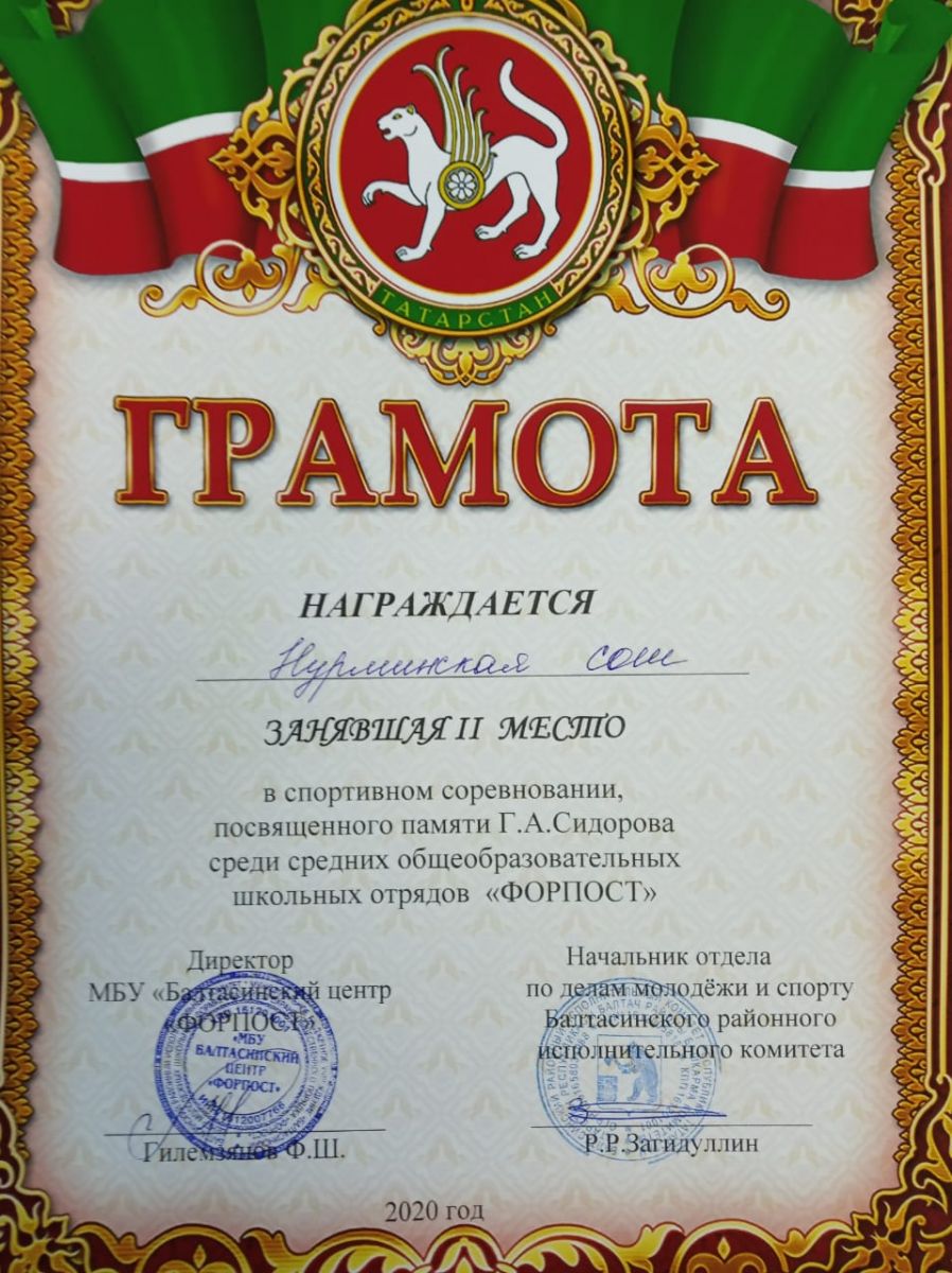 Опубликовано: 13.02.2020Мәктәпнең ФОРПОСТ отряды Г.А.Сидоров истәлегенә багышланган спорт ярышларында 2 нче урын алды.