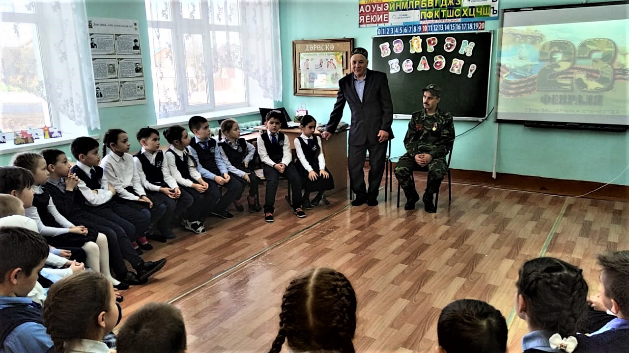 22 февральдә 2а, 2в сыйныфларында "Солдатта булган диләр” темасына очрашу узды. “Ягез әле, егетләр” уены үтте.