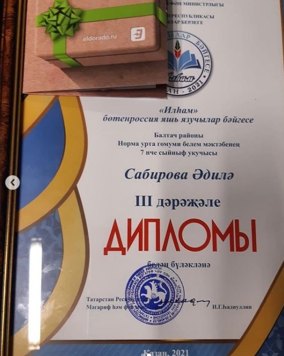 Опубликовано: 23.04.2021Год родных языков и народного единства. Всероссийский конкурс юных писателей «Илһам». Обучающаяся 7 а класса Сабирова Адиля заняла III место.