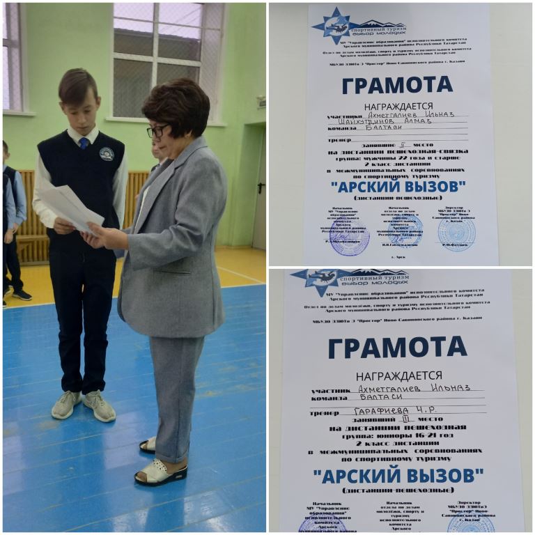 Опубликовано: 08.11.2021По-разному проводят свои каникулы ребята. Некоторые отдыхают дома, кто - то у родственников, но главное – провести это время с пользой, заняться своим любимым делом, чтобы было о чем вспомнить. Этим ребятам есть что вспомнить. Их каникулы прошли с пользой. Соревнования по туризму. Ахметгалиев Ильназ награждается грамотами за II место на дистанции пешеходная -связка и за III место на дистанции пешеходная . Шайхутдинов Алмаз награждается грамотой за II место на дистанции пешеходная-связка .