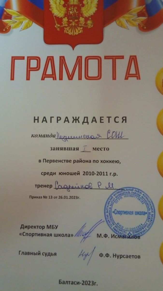 27 января 2023 год. Наша команда - чемпионы района по хоккею среди учащихся 2010-2011 годов рождения. Обучающийся 4б класса Галиев Фидан - лучший вратарь турнира.Тренер Садыйков Р.М. С победой вас чемпионы!