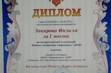 Поздравляем Закирову Инзилю, ученицу 5 класса, занявшую 1 место во Всероссийской олимпиаде "Войны священны страницы" (куратор Калимуллин Р.Н.)