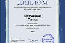 Гатауллина Сәйдә "Космос рәсеме" номинациясендә Бөтенроссия конкурсында 1 урын өчен диплом белән бүләкләнә. Конкурс эше: "Космос"