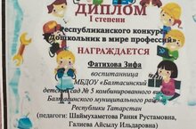 Фатихова Зифа награждается дипломом I степени I Республиканского конкурса "Дошкольник в мире профессий"