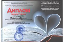 Дипломом лауреата 2 степени награждается Шакирзянова Камилла в Региональном конкурсе художественного чтения "Не жалейте слов хороших" посвященный Дню защитника Отечества и Международному женскому дню.