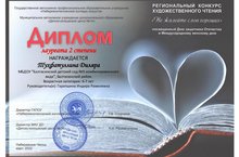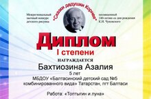 К.И.Чуковский тууына 140 ел тулу уңаеннан "Корней бабай әкиятләре" Төбәкара читтән торып үткәрелгән конкурста Бахтиозина Азалия 1 дәрәҗәле диплом белән бүләкләнде. "Топтыгин hәм ай" эше. Педагог: Латыйпова Ләйлә Наилевна