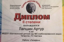 К.И.Чуковский тууына 140 ел тулу уңаеннан "Корней бабай әкиятләре" Төбәкара читтән торып үткәрелгән рәсем конкурсында Лапшин Артур 2 дәрәҗәле диплом белән бүләкләнде. "Телефон" эше. Педагог: Лапшина Алсу Нурисламовна