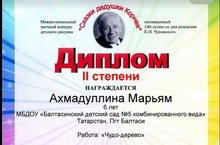 К.И.Чуковский тууына 140 ел тулу уңаеннан "Корней бабай әкиятләре" Төбәкара читтән торып үткәрелгән рәсем конкурсында Ахмадуллина Мәриям 2 дәрәҗәле диплом белән бүләкләнде. "Чудо-дерево" эше. Педагог: Хафизова Фарида Фирдависовна